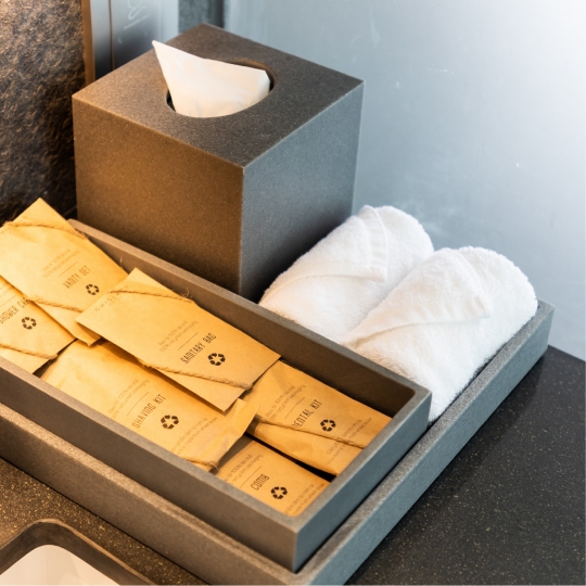 All amenities are packaged in paper packaging which is a recyclable and completely environmentally friendly material.