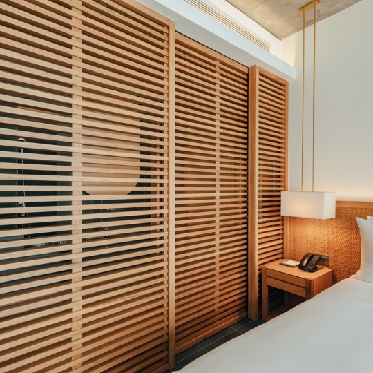 CHICLANDのホテルの部屋の家具は自然から着想を得たものです。自然な木製スライドパーティションは部屋に広々とした繊細な感覚を作り出します。竹とラタンの空間で、自然に親しみを感じながらリラックスできるようになります。